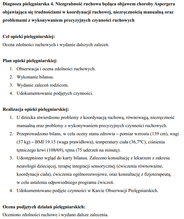 - przykładowy opis przypadku dziecka z autyzmem (zespołem Aspergera) – 2 strony,