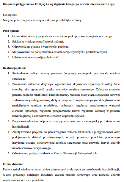 ✔️ przykładowy proces opieki pielęgniarskiej nad pacjentem po zawale mięśnia sercowego wg modelu V-etapowego, w tym 12 diagnoz, cele opieki, plan, realizacja planu opieki i wynik podjętych działań (12 stron).