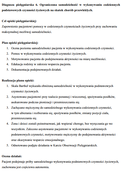 – przykładowy proces pielęgnowania pacjenta, w tym 12 diagnoz, cele opieki, plan, realizacja planu opieki i wynik podjętych działań (13 stron).