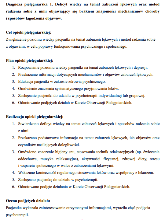 - przykładowy proces pielęgnowania pacjentki z zaburzeniami lękowymi, w tym 10 diagnoz, cele opieki, plan, realizacja planu opieki i wynik podjętych działań – 10 stron.